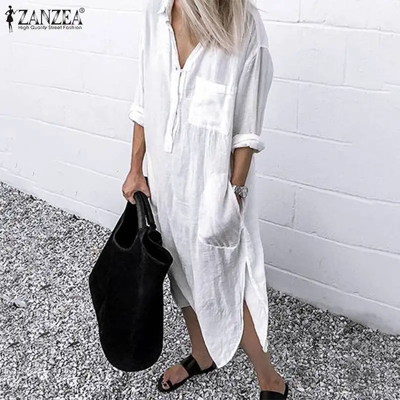 HIGH QUALITY ZANZEA 2020 Women Lapel Long Sleeve Autumn Shirt Dress Cotton Split Dresses Elegant Solid Work Offi
