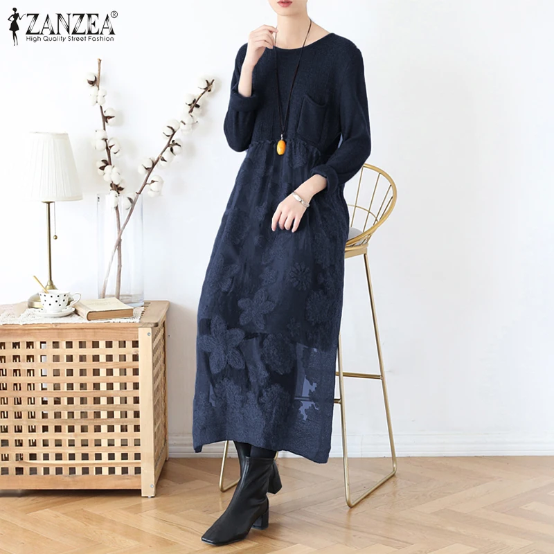 HOT Sale ZANZEA Fashion Lace Patchwork Dress Womens Spring Sundress Long Sleeve Split Vestido Female Casual