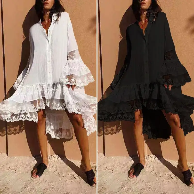BEST SELLER Bohemian Women Lace Pacthwork Sundress ZANZEA Summer Flare Sleeve Ruffles Hem Beach Dress Casual V