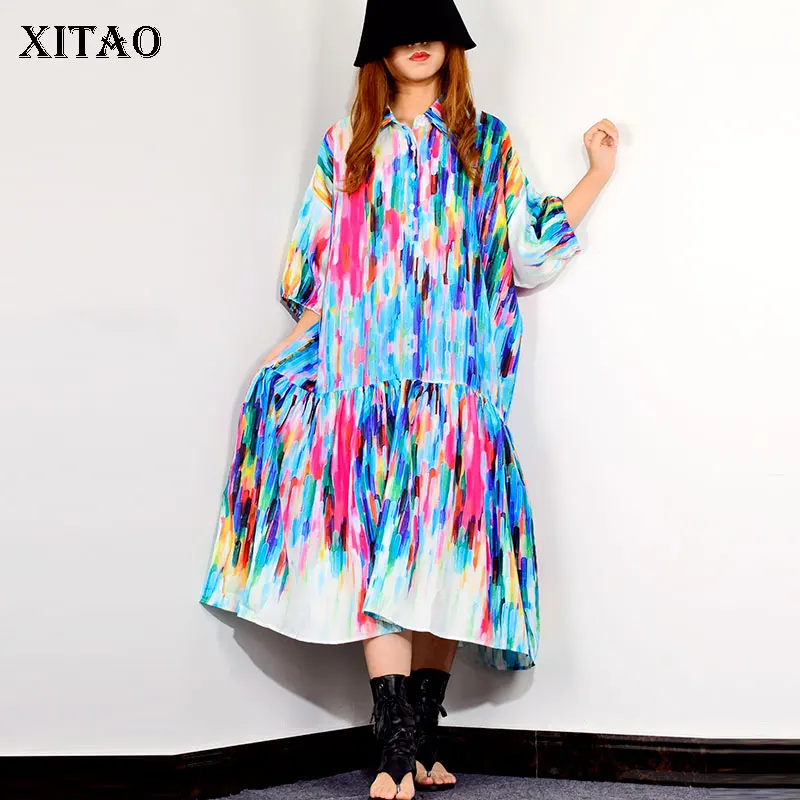 ORIGINAL XITAO Print Multi Color Striped Draped Hem Midi Length Dress Women 2019 Casual Plus Size Bating Sle