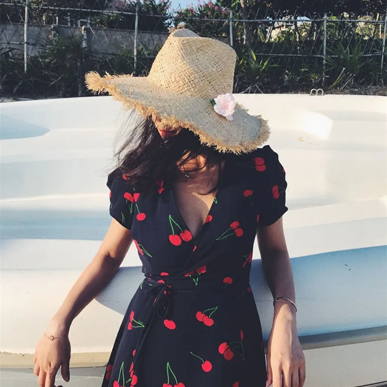 TOP Plus Size Women Dress Cherry Print Short Sleeve Vintage French Dress V-neck Midi Dress Chiffon Summ